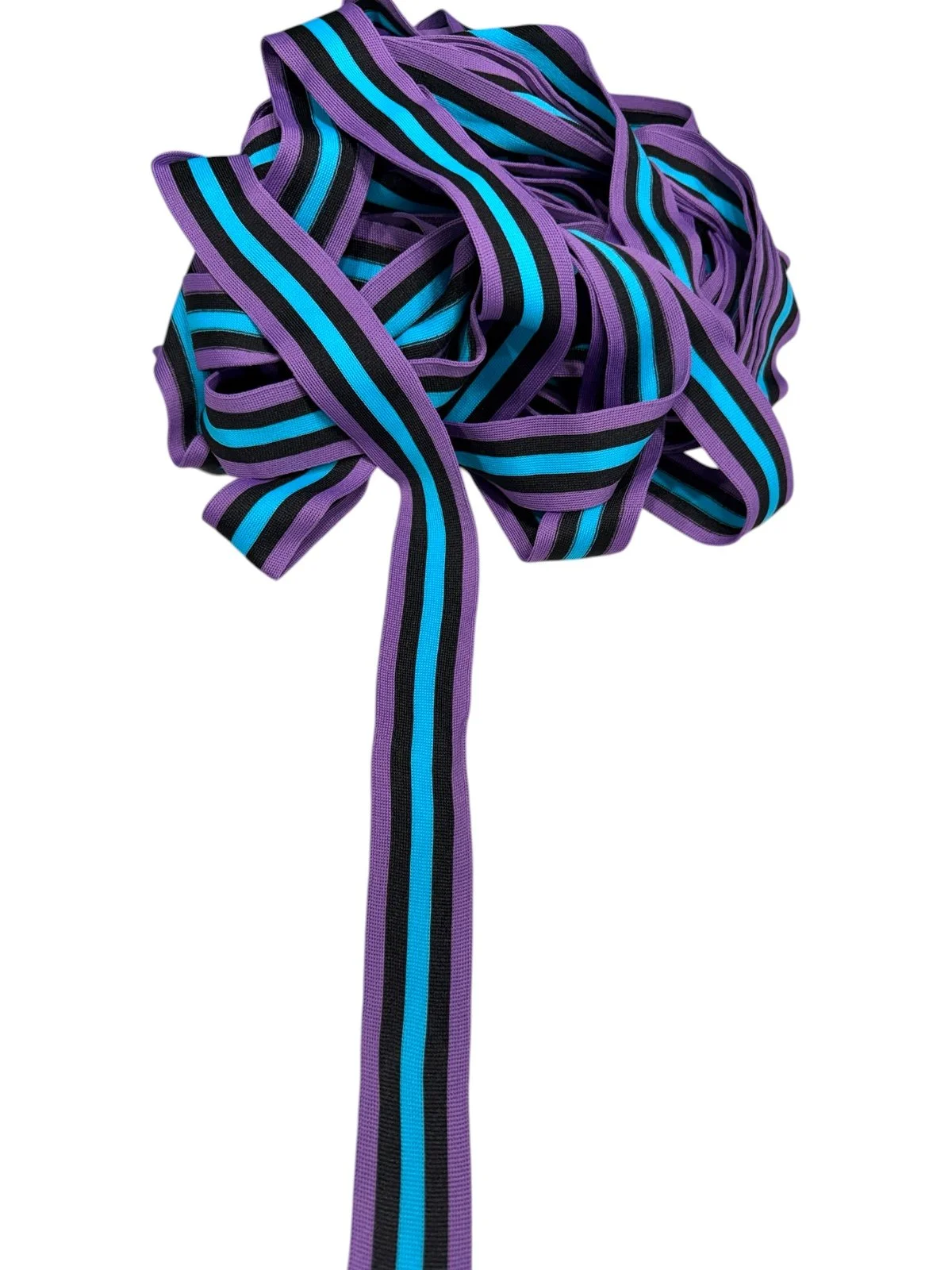Bold, graphic, and unapologetically sporty. This 1 1/2” knit sports trim features a rich purple base with black and vibrant turquoise striping for a high-contrast, statement-making look.